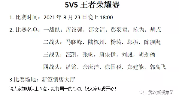 縱橫王者峽谷多年,是不是已經(jīng)練就一身絕技?8月23日晚上六點(diǎn),數(shù)商事業(yè)部在覃偉覃總和鄧武鄧總的帶領(lǐng)下,開展了一場王者榮耀5V5爭霸賽。8月21日上午,我們就發(fā)出了比賽的邀請通知,大家都踴躍報名,經(jīng)過篩選,我們很快確定了參加人數(shù)并且分好了戰(zhàn)隊。8月21日下午,為了給大家充分地準(zhǔn)備時間,我們也提前發(fā)出了比賽通知。